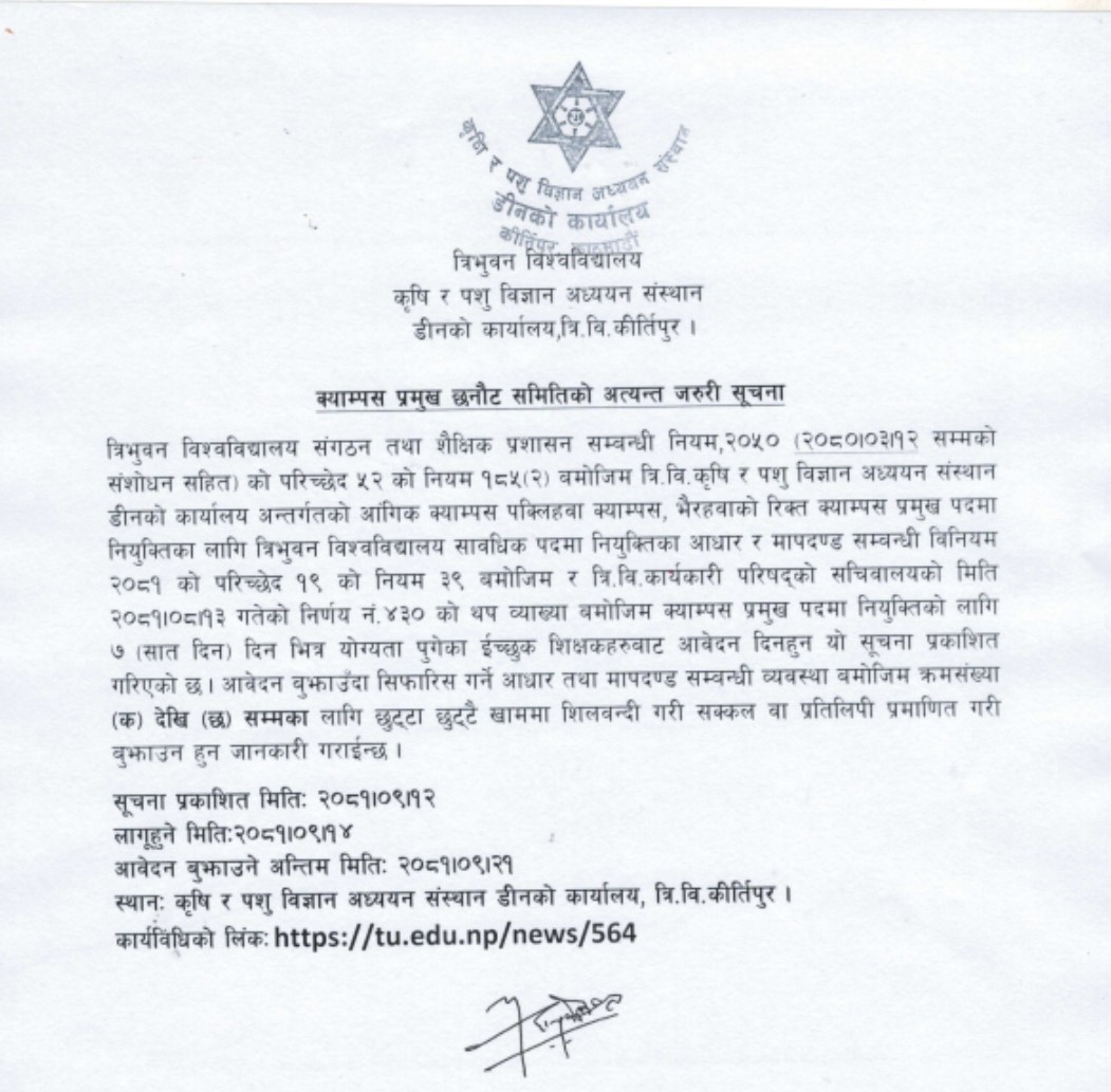 क्याम्पस प्रमुख छनाैट समितिकाे अत्यान्त जरुरी सूचना ।।